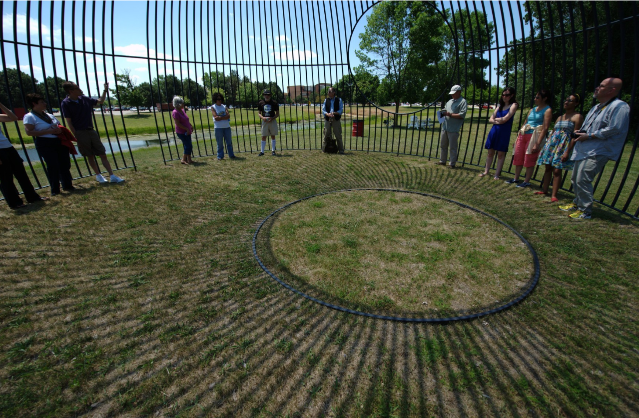 This steel landmark that looks like an over-sized bird cage, located near a pond by the Ryder Center, is officially named the Annual Ring. On the Summer Solstice (between June 20-23 each year), when the sun reaches its highest point in the sky, the sunlight shines through the opening on the top of the structure, and the shadow cast matches the ring on the ground of the structure.