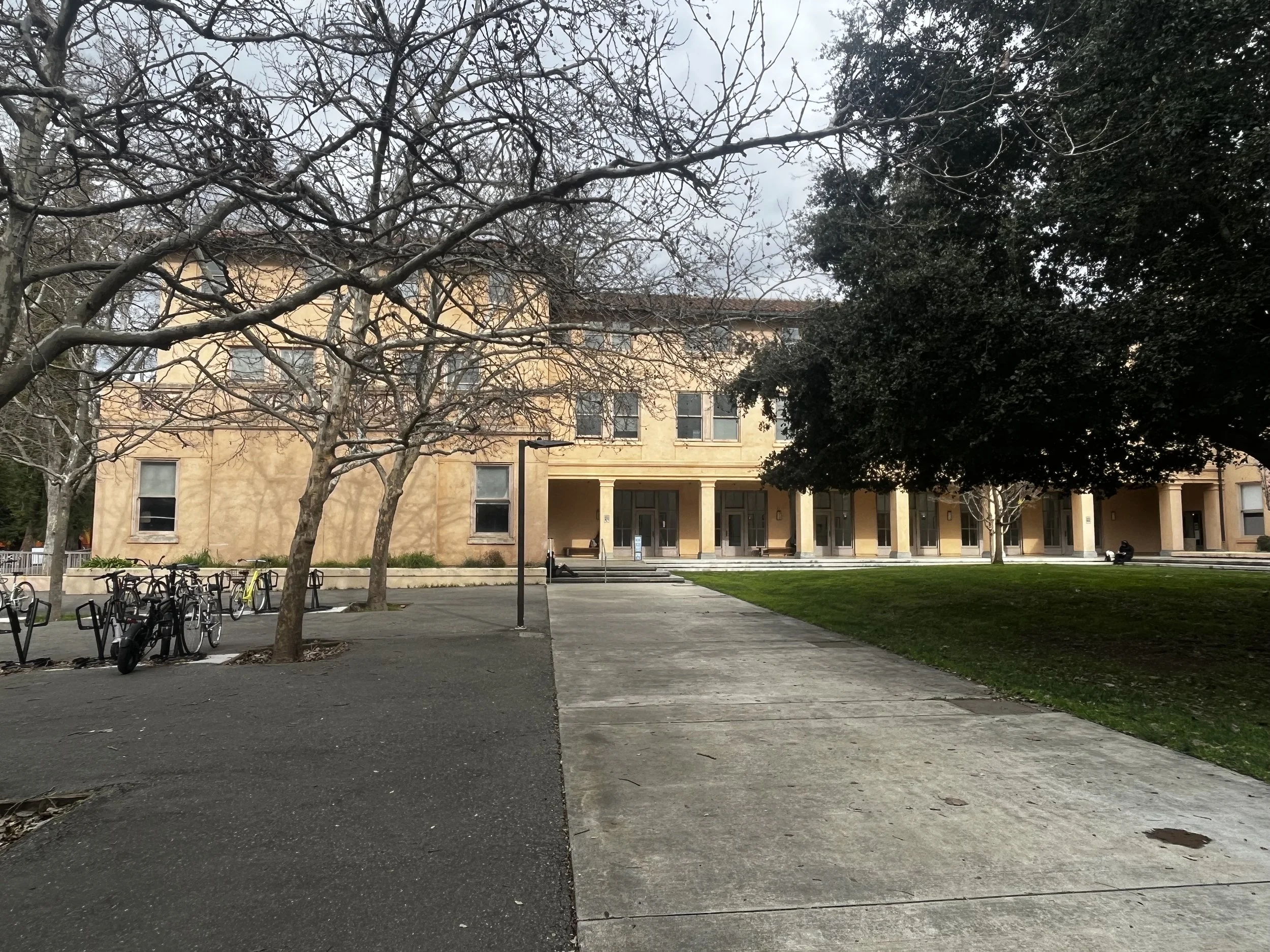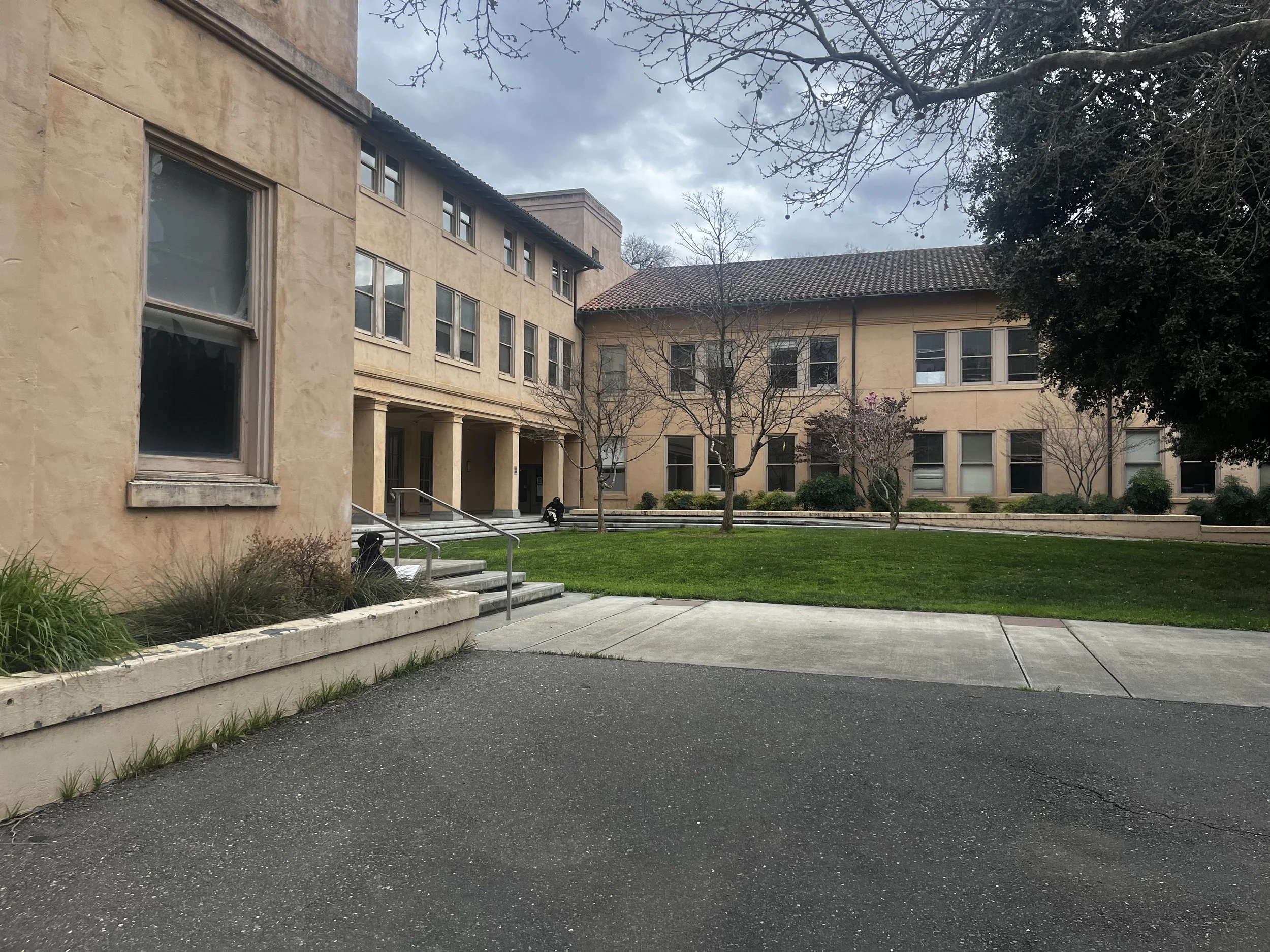 Hart Hall is a building on UCD Campus, a red roof top, an L shape structure created a court yard in the middle.