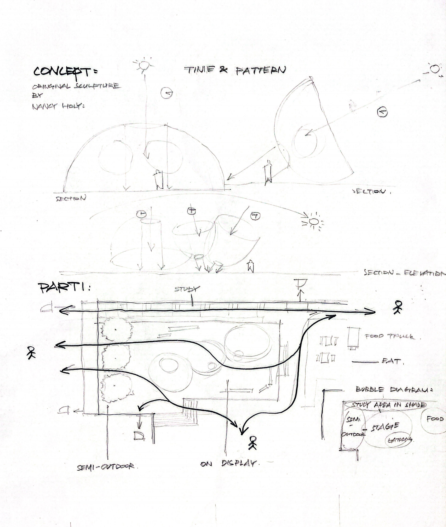 This project synthesizes site analysis, and programming to create a comprehensive, concept-driven landscape design. Students will analyze site conditions and integrate characteristics of a provided sculpture to inform their conceptual approach, using Hart Hall courtyard as the project site. The project requires developing a program that accommodates key functional spaces, such as outdoor seating, circulation, and access while maintaining a focus on conceptual design.